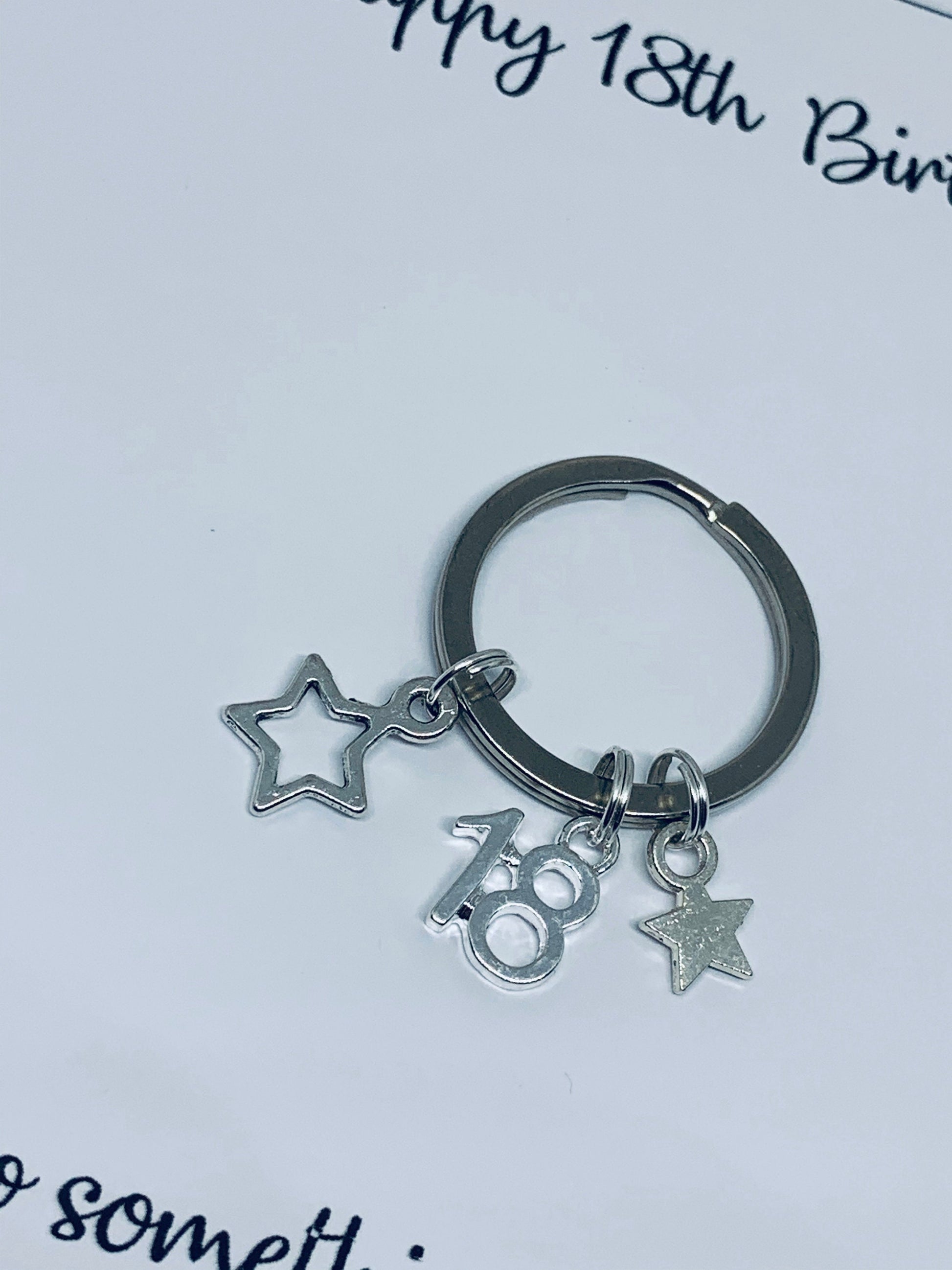 A keyring featuring 2 tibetan silver star charms and a 18 charm. 💕