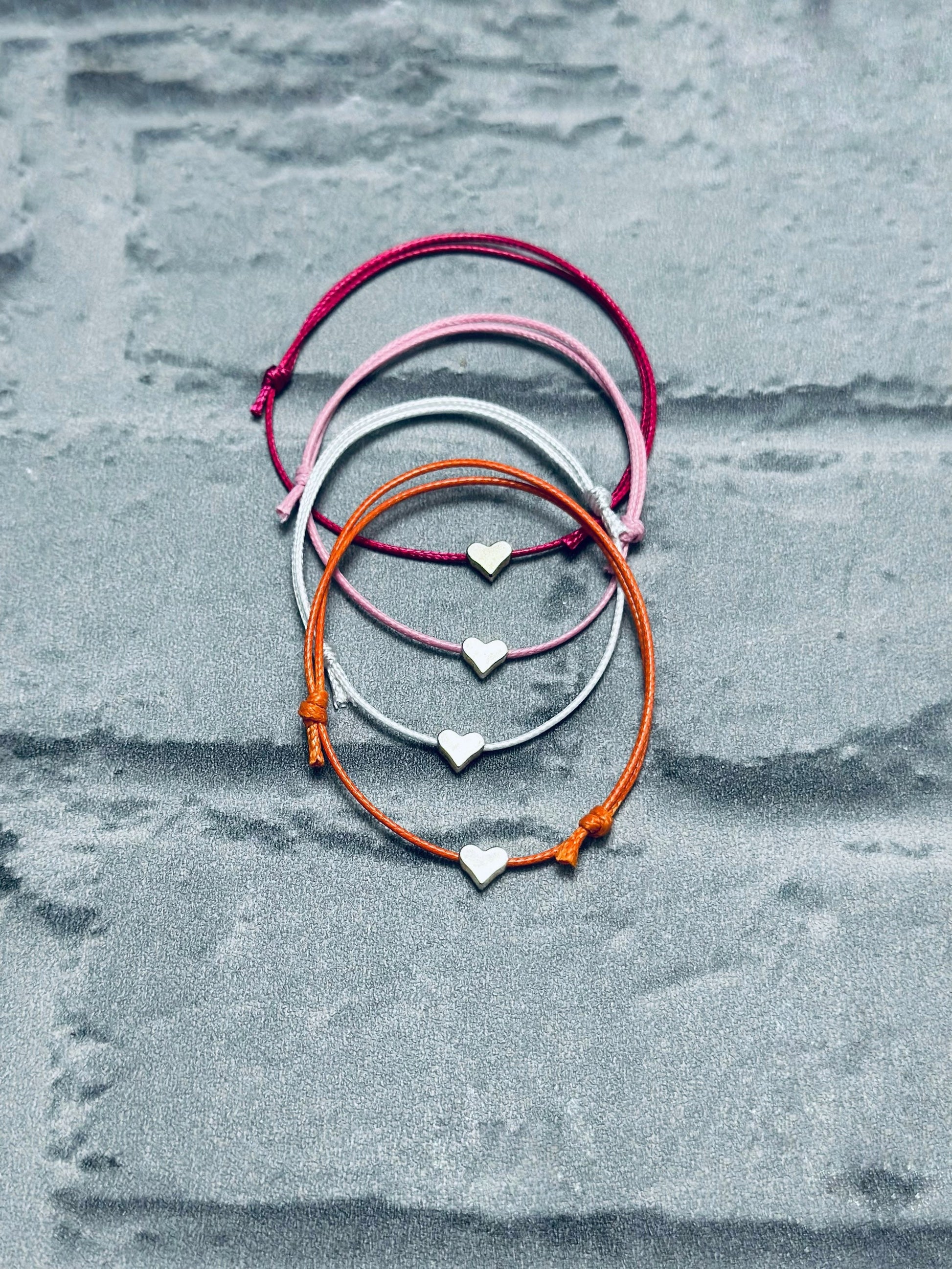 A simple waxed cord fully adjustable set of 4 bracelets in dark pink, light pink, dark orange and white